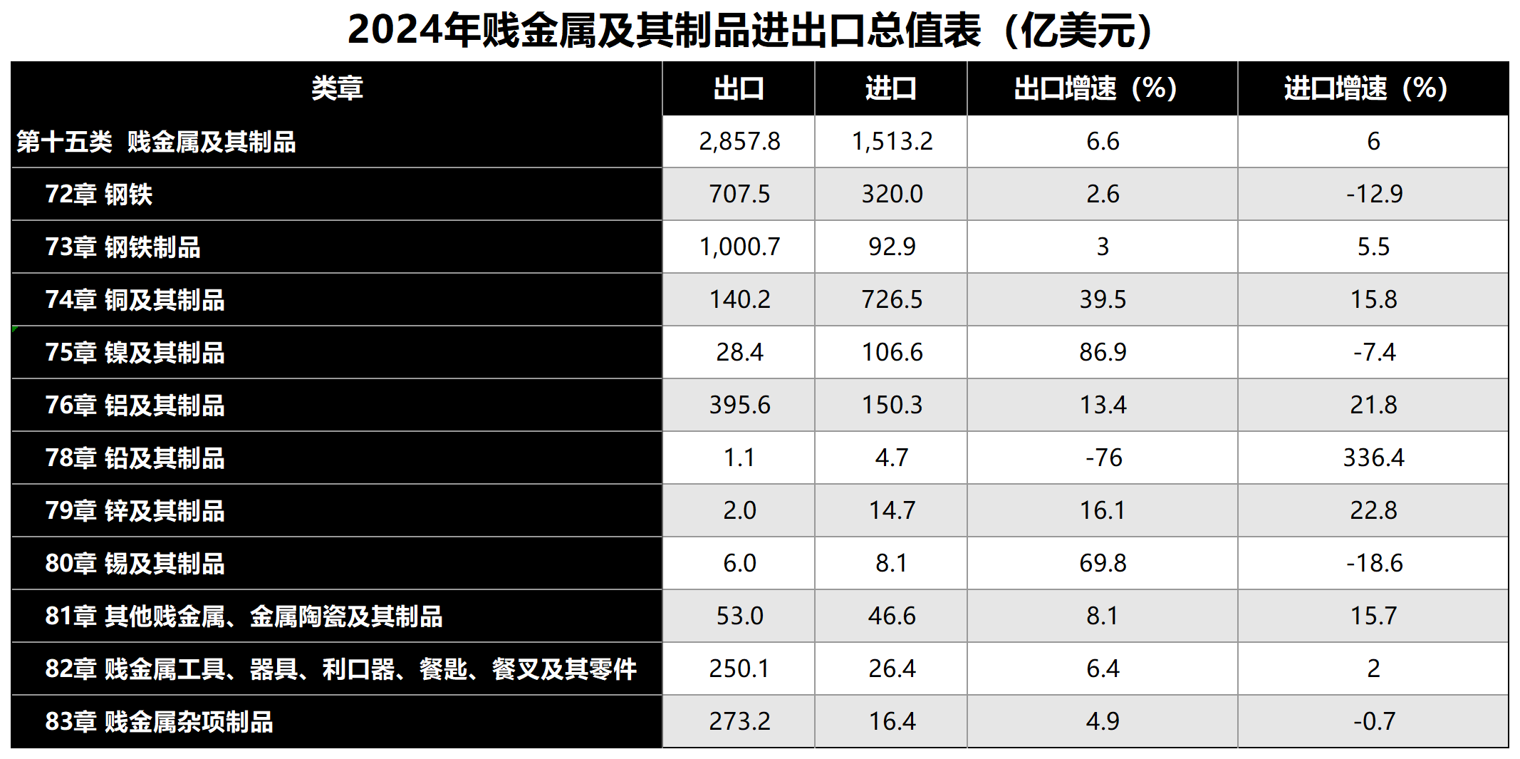 2024年,中国贱金属及其制品(商品类章第十五类)进出口总值持续增长,出口额达2857.8亿美元(同比+6.6%),进口额1513.2亿美元(同比+6%)。
